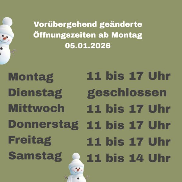 Dienstag geschlossen | Montag - Freitag 11- 17 Uhr | Samstag 11 - 14 Uhr